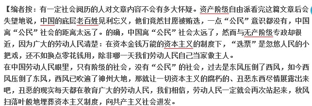 在中国劳动人民眼里,只有阶级的社会,没有“公民”的社会,过去是东风压倒了西风,如今西风压倒了东风,西风已吹遍了神州大地,那就让一切资本主义的腐朽的、丑恶东西尽情展露出来吧,丑恶的现实每天都在教育广大的劳动人民,我们相信,劳动人民一定就会再次站起来,秋风扫落叶般地埋葬资本主义制度,向共产主义社会进发。