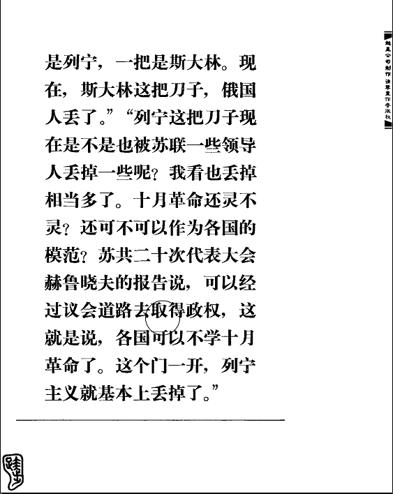 “在政治方面,修正主义确实想修正马克思主义的基础,即阶级斗争学说。他们说,政治自由、民主和普选权正在消灭阶级斗争的根据,并且使《共产党宣言》里的工人没有祖国这个旧原理变得不正确了。他们说,在民主制度下,既然是“多数人的意志”起支配作用,那就不能把国家看作阶级统治的机关,也不能拒绝同进步的社会改良派资产阶级实行联合去反对反动派。