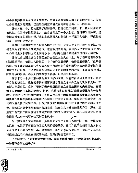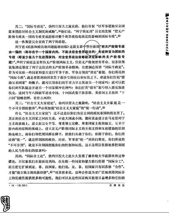 “‘革命’的先生们,且慢着高兴!按照你们的逻辑推理,如果把资产阶级自由派看作美狗汉奸,那么蒋介石何尝不把毛泽东看作“苏狗汉奸”呢?俄国沙皇何尝不把列宁看作“德狗俄奸”呢?这样恰恰就是你们所要的口口声声的“革命”么?无产阶级决不需要这种“革命”,也不会在你们“保卫祖国”的喧嚣中,随着你们的脚步而“革命”,更不会随着你们出卖无产阶级革命利益,支持官僚资产阶级镇压群众运动中,实现你们所谓阶级的“独立性”和“领导权”而起舞。”