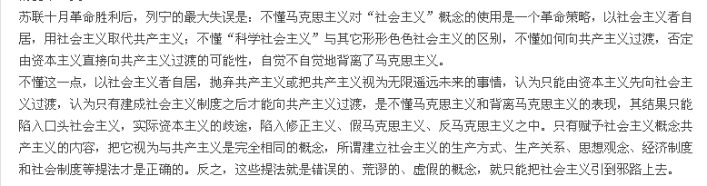 苏联十月革命胜利后,列宁的最大失误是:不懂马克思主义对“社会主义”概念的使用是一个革命策略,以社会主义者自居,用社会主义取代共产主义;不懂“科学社会主义”与其它形形色色社会主义的区别,不懂如何向共产主义过渡,否定由资本主义直接向共产主义过渡的可能性,自觉不自觉地背离了马克思主义。