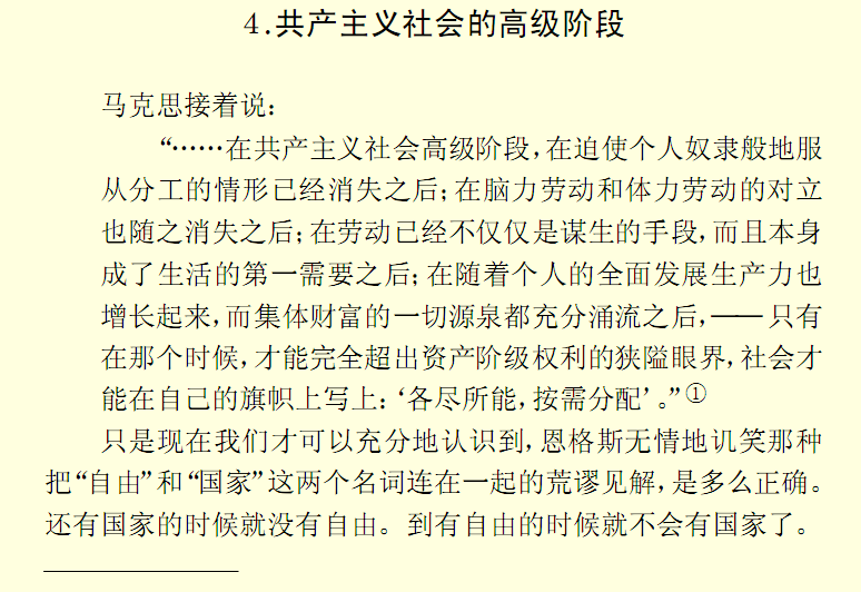 当社会主义彻底完成这一任务,彻底消灭商品生产和货币交换,彻底健全计划经济的时候,一切阶级差别才会而且必定被彻底消灭,共产主义的生产关系、社会关系和思想观念才会完全取代一切旧的生产关系、社会关系和思想观念。那时社会主义就完成了自己的历史使命,人类就进入了共产主义社会高级阶段。