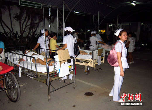 根据美国地质勘探局地震信息网发布的消息,缅甸东北部地区当地时间3月24日晚,在相距不到一分钟时间内连续发生两次7级强震。泰国、越南、我国云南和广西等有震感。图为泰国清莱震感明显,医院病人被疏散至室外。