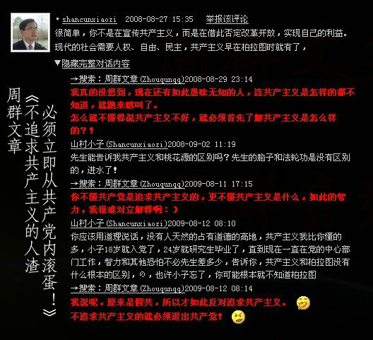 这些人渣甚至已经发展至居然胆敢跑到我周群的博客上也胡言乱语了,其中之一的人渣竟然在我《共产党打压宣传共产主义的人和事将成为历史笑柄》一文后留言道:“先生能告诉我共产主义和桃花源的区别吗?先生的脑子和法轮功是没有区别的,进水了!”“你应该用道理说话,没有人天然的占有道德的高地,共产主义我比你懂的多,小子18岁就入党了,24岁就研究生毕业了,直到现在一直在党的中心部门工作,智力和其他恐怕不必先生差多少,告诉你,共产主义和柏拉图没有什么根本的区别,也许小子忘了,你可能根本就不知道柏拉图”。