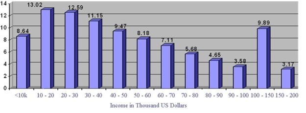 我们会发现,收入结构柱状图的高低走向犹如两个隆起,看似收入在10万美元以下的“低层阶级”构成了第一个,收入超过10万美元的“上层阶级”构成了第二个,“上层阶级”得数目大约占了总人数的13%。而在过去的苏联,人们的收入结构分布却是另外回事:真正意义上的“上层阶级”并不存在,高收入家庭占有的比率迅速而又均匀地下滑。