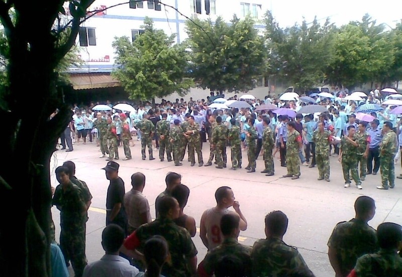 6月22日,广州番禺化龙镇眉山村世门手袋厂几千名员工大罢工,抗议韩国管理层对待中国工人刻薄而没有人性。当地政府出动了很多交警、警察和武警在现场拉上警戒线。