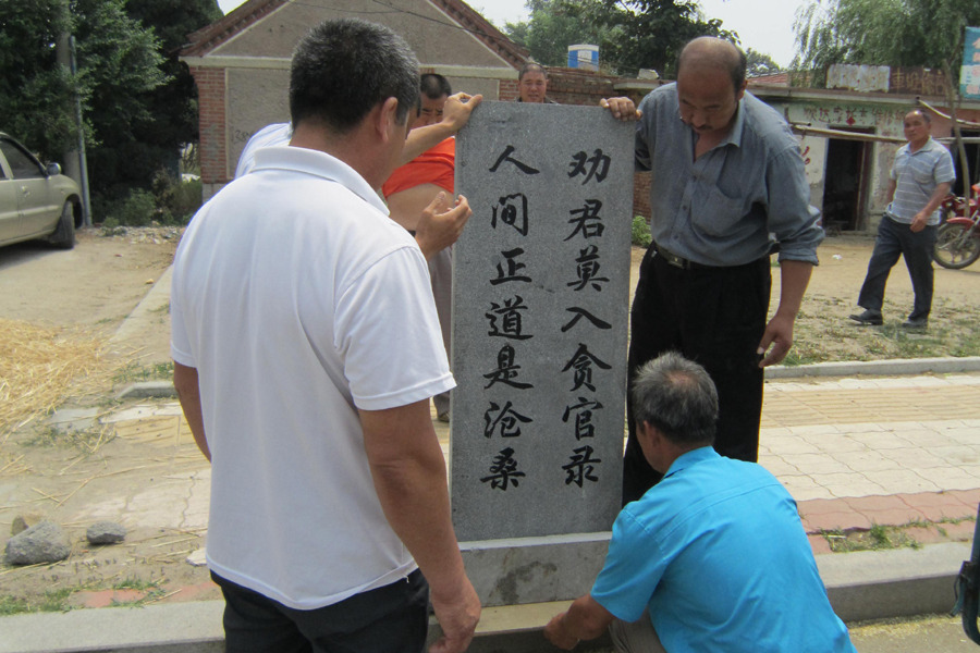 劝君莫入贪官录,人间正道是沧桑。”张秀芳老两口说其实他们刻贪官碑的目的就只有一个:立这个碑就是为后人,不要走这条路,走好的路走正路。关系到子子孙孙往正道上发展。张秀芳的老伴陈淑训告诉记者, 立这个碑的目的突出的就是这个字“劝”,劝君莫入贪官录,请不要落在他们这个碑上面。