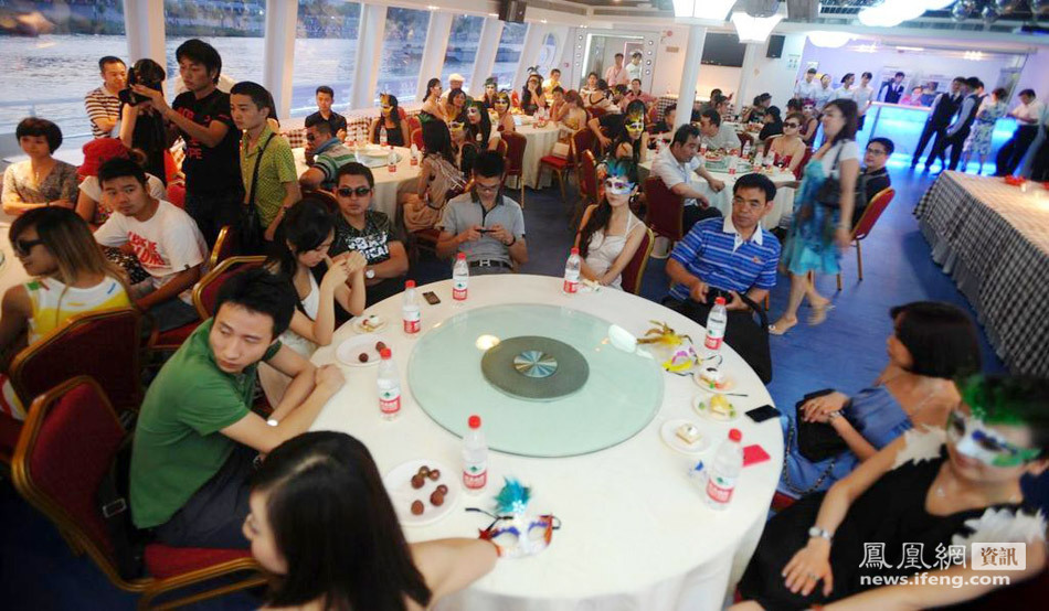 7月2日,相亲现场。下午6点,盛装打扮的女嘉宾登上游轮,每人以面具示人。富豪们多不愿接受采访。记者了解到,与会富豪主要从事地产、金融、酒店、医疗等行业,20多岁到50多岁不等。