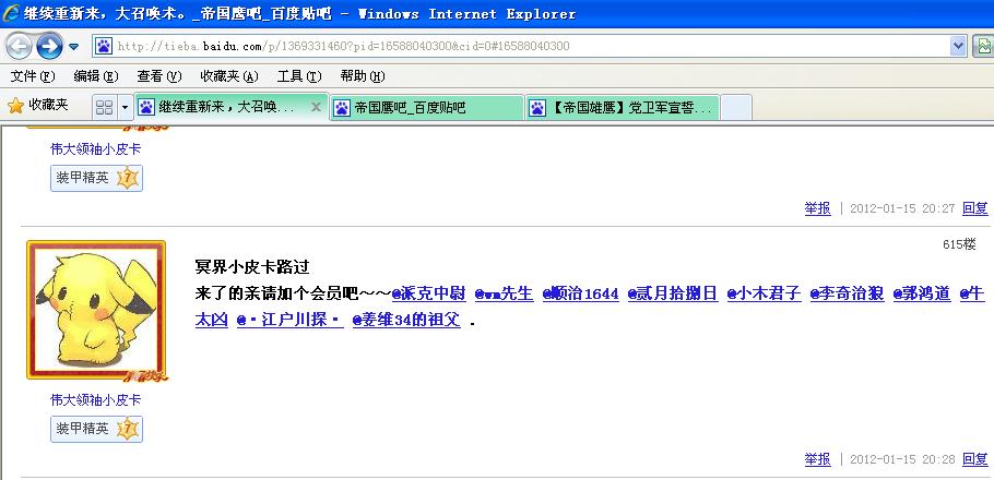 在7月26日爆吧之后,万山戴雪为将本人从吧主位置上投诉下来,不但发动其党羽进行诬告,还找来了专门投诉诬告吧主的流氓水军.因大量的诬告投诉,本人与7月29日被撤下了吧主.