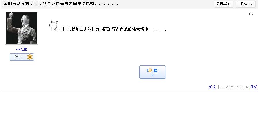 万山及其党羽,一面反复强调自己是"左派",一面却是不顾立场,不顾"左派"形象,长期讨好,附和崇拜"元首阿道夫"的吧主.