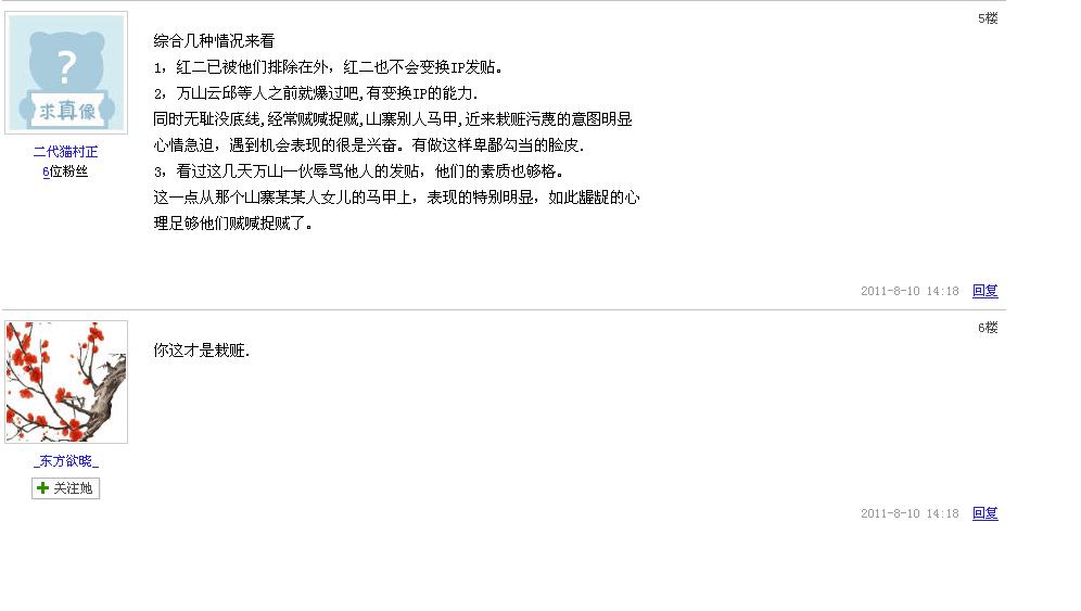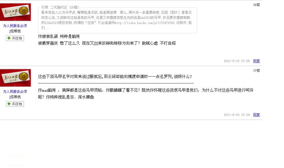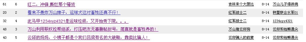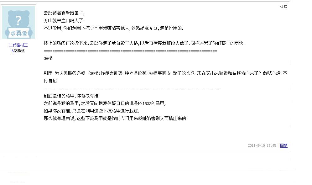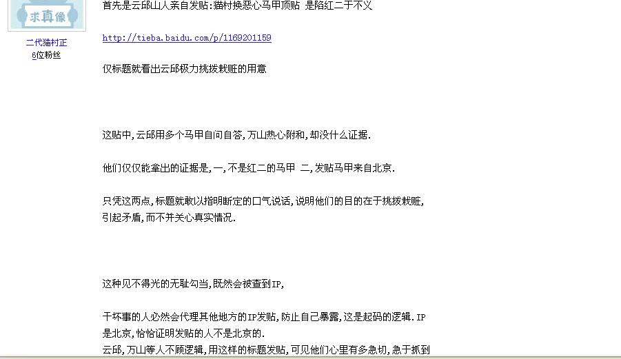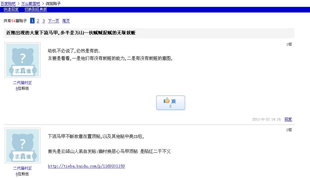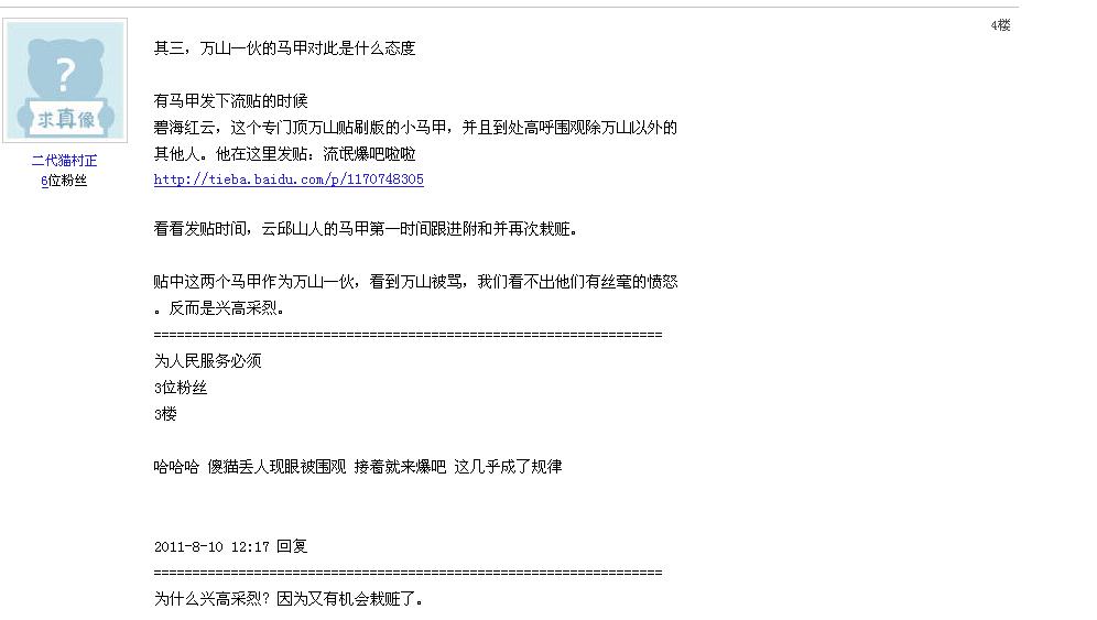 万山戴雪不顾之前对本人不择手段的打击污蔑,竟厚颜无耻的跑来要求:本人将其加回吧主,再主动辞职.并不断在吧内以"受迫害的左派"姿态满地打滚,发贴自吹.随即被到长期被万山及其党羽欺压,污蔑的网友对其进行了强有力的揭露,批判.上面所举例贴就是其中之一.耍赖不成,立刻又撕下脸面,公开的进行挑拨离间,挑拨网友间争夺吧主职位.见未达预期效果后暂时离开.