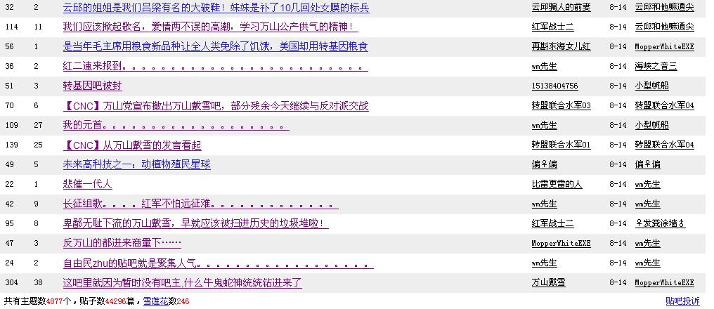 万吧无吧主后,万山戴雪为重新申请吧主,无所不用其极,很难理解,为了一个吧主可以如此不择手段,究竟是出于什么目的.