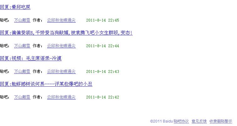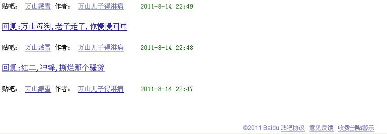 11年7月25日万山戴雪因违反贴吧管理规定被撤下吧主,本人掌管该贴吧后,因无法再靠删贴毁证继续伪装"左派"进行投机,万山党跨越人类道德廉耻底线的表演就此开始了.