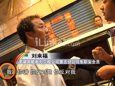 于是当地电视台记者就此前往采访,未料芜湖国能电力工程公司第五分公司原负责人孙庆云见到记者后,直接把自己关在了办公室避而不见,随后主角登场,芜湖国能电力工程公司第五分公司专职安全员刘来福冲了出来,并连连大呼“你是不是共产党员”,“你反对我吗”,“你对共产党员就这种态度啊”等,最后更说出了上面那句令人备感震惊的话来。