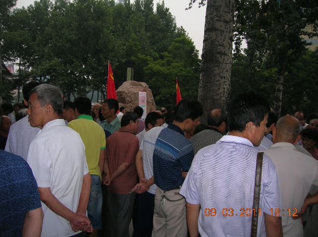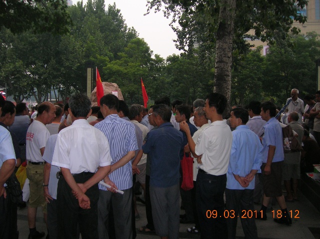 9月2日(星期五)下午4点多钟,广场坚决拥护毛泽东的那个农民工,刚走到广场大石头的东边,被那个老卖假烟的反毛分子拉住,二人发生争执,随后五六名年轻人蜂拥而上,对农民工开始毒打。农民工顺手将啤酒瓶磕烂,展开反击,几个前边暴打农民工的年轻人往后退缩,后边的两个人从两边扭住了农民工的胳膊,前边的几人趁势又对农民工开始暴打。