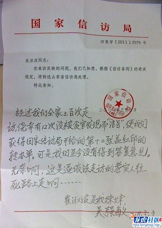 党中央反复强调各级各部门,要加强构建和谐社会建设和规范执法行为。上访是既耗人力物力财力,又影响和谐社会建设的事情。从心里说,我们一万个不愿意上访。可是,我们不上访谁来给解决问题呢?我们申诉、举报、控告了9年多共发出6000多封次信和本人亲访上百次,却始终得不到答复意见或任何告知或“信访三见面”。而贪官却伪造假材料向领导汇报说“该案已经办结当事人满意”,同时又威胁我“如再告就劳教你两年。”贪官这是在故意制造不安定因素逼着我们上访,这也是我们无奈的选择。