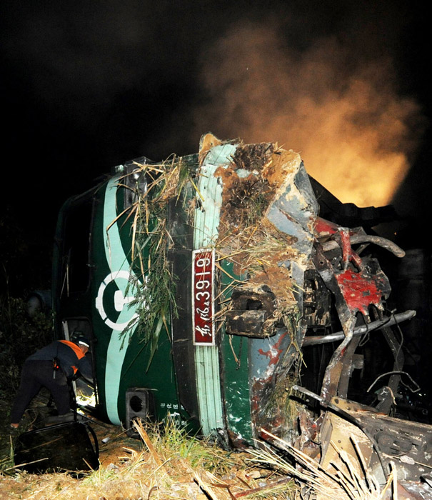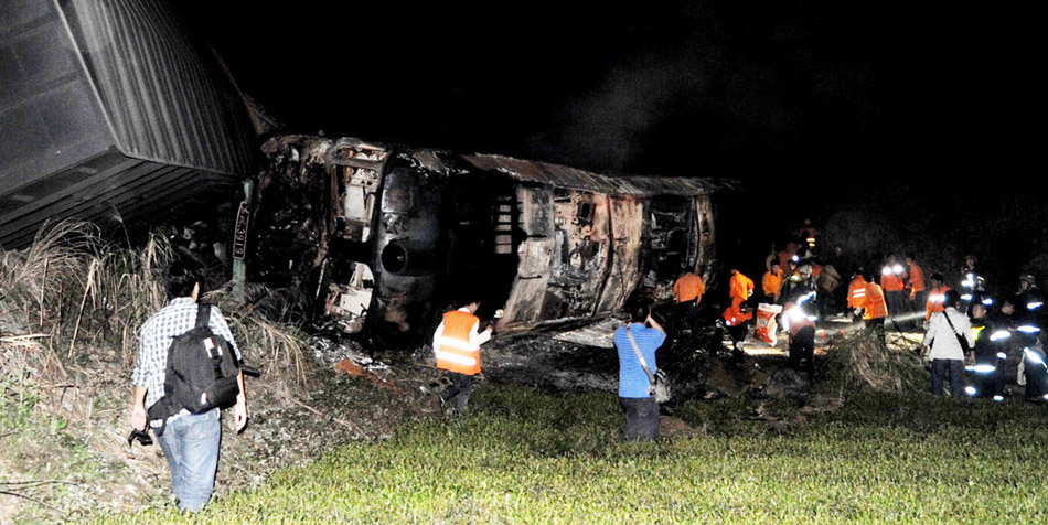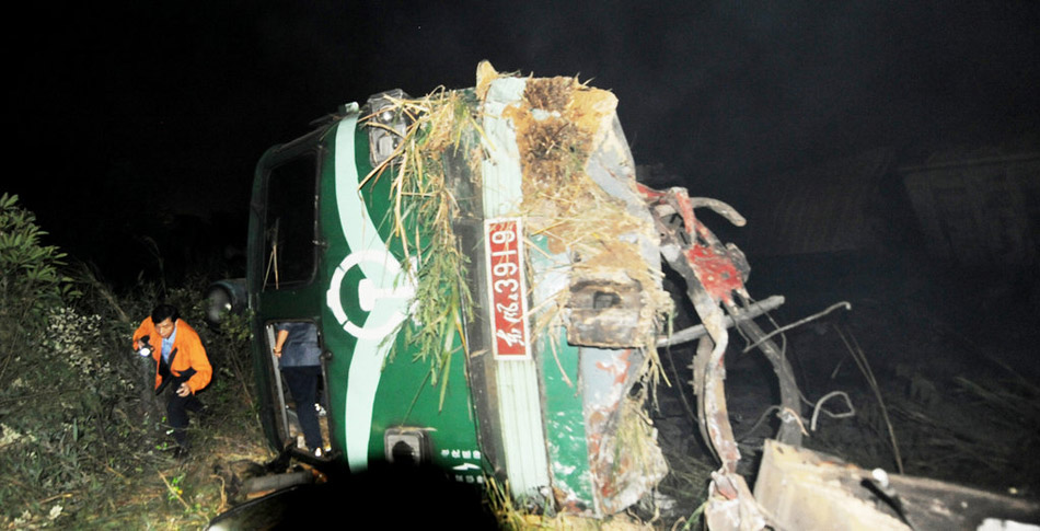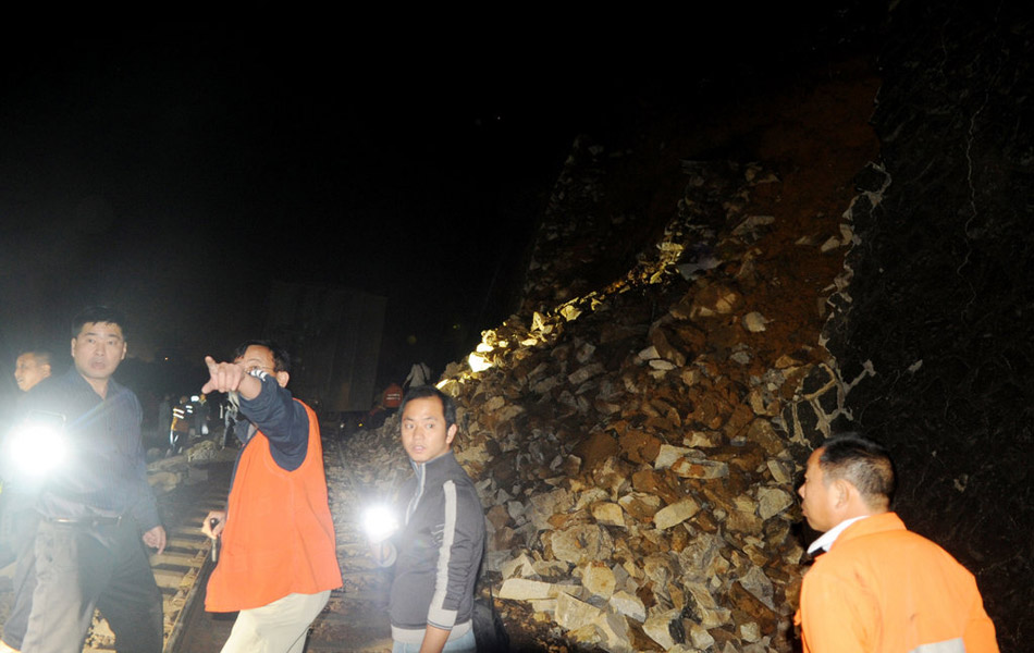 2011年10月19日,福建泉州,漳泉铁路货车脱线事故事发现场。18日22时25分,48019次货物列车运行至福建漳(平)泉(州)铁路湖头至金谷间K84公里+150米处,撞上塌方坍体,造成机车侧翻及机后4节车辆脱线,中断行车,幸无人员伤亡。