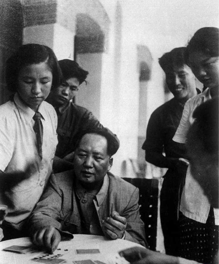1954年,毛泽东与工作人员打扑克。
