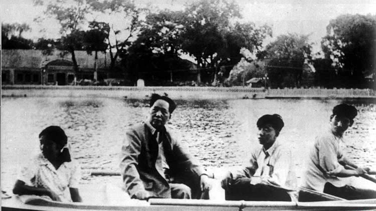 1954年,毛泽东与李敏和工作人员在中南海划船。
