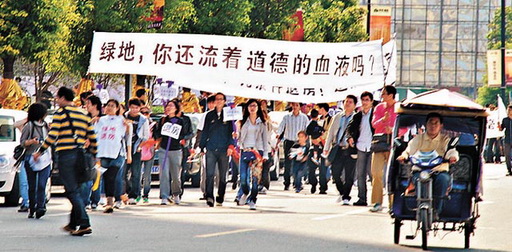 因不满地产商减价引发业主示威潮的包括龙湖地产、绿地集团和中国海外在上海嘉定和浦东区的楼盘。「钱付了、贷款还了,可大半年下来,房子没见着,房价倒缩水三分之一!」嘉定区绿地开发的「秋霞坊」上百名业主前日「攻佔」售楼处,里面一片狼藉贴满了标语横幅。部份人更一度拉起写着:「绿地你还流着道德血液吗?」的横额上街游行。大批公安出动拉起警戒线拦截。