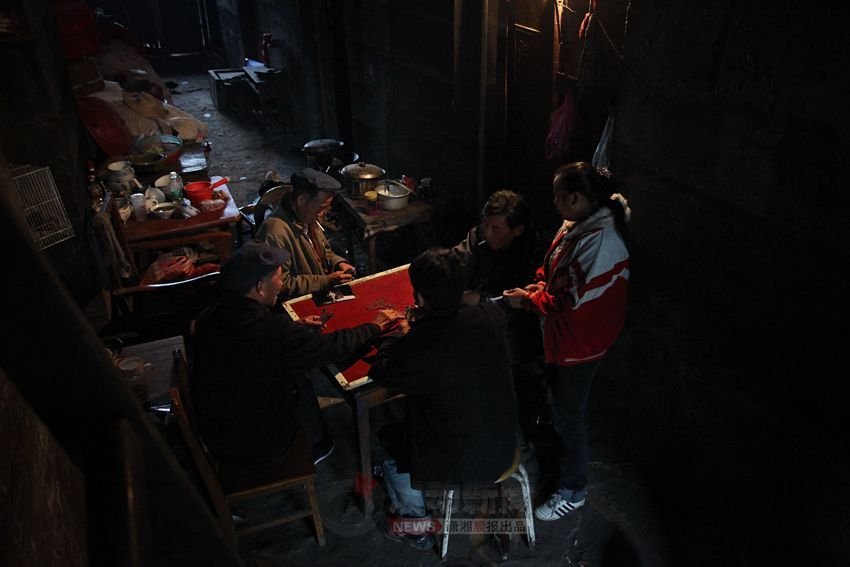 过道“客厅”偶尔也有娱乐,下雨的时候捡不了废品,大家就围在一起打打跑胡子,这也是他们唯一的娱乐方式。潇湘晨报 唐杰/摄