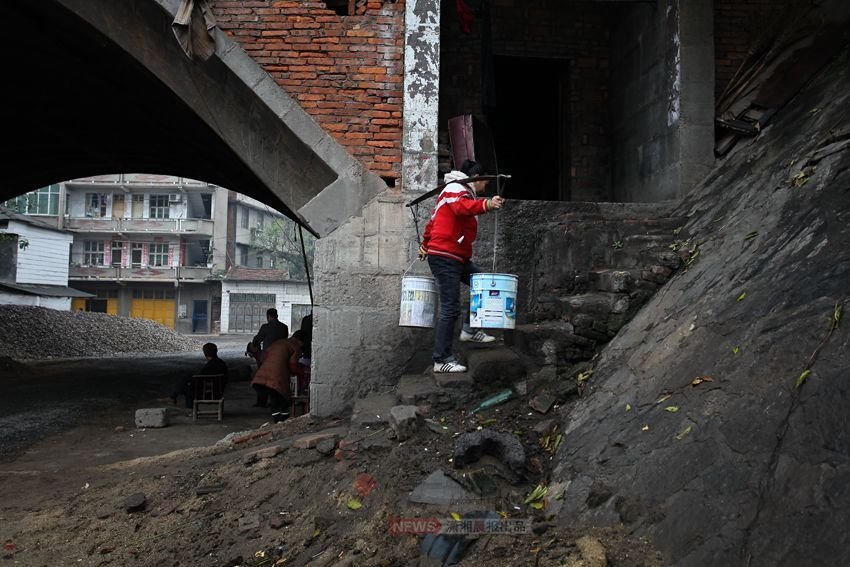 龚老的老伴雷桂香今年68岁了,这个桥洞里没有自来水。每天,她都会去附近居民家买水挑回来,40块钱一个月,龚老在家时,她负责挑到楼梯下,今天龚老出去找活了,她只能蹒跚的移步上去。潇湘晨报 唐杰/摄