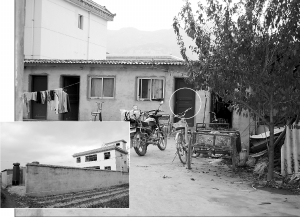 嫌疑人新建的二层小楼(左下)和事发出租屋仅一路之隔。画圈处为事发出租屋。