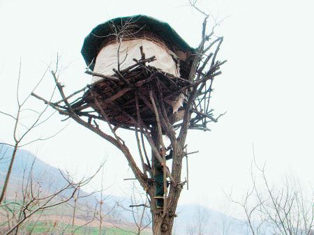 眉县农民杜仕升在树上建的房子。图片来源:西安晚报