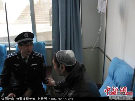 图为队员熊波头部被打伤出血,在医院缝针后输液。