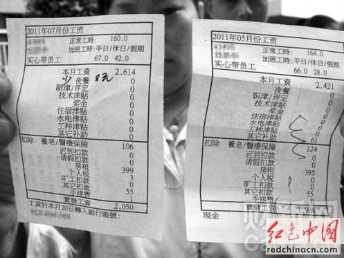 工人展示自己的工资单。 图片来源:网络