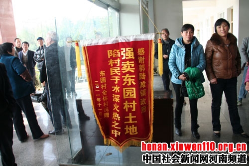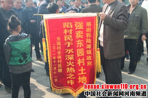 2011年11月11日上午,固始县郭陆滩镇东园社区的八十多名村民敲锣打鼓携“感谢郭陆滩镇政府强卖东园村土地 陷村民于水深火热之中”的“锦旗”送到镇政府。