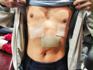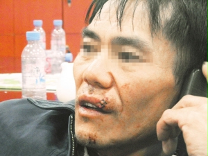 農民工老李傷痕累累,農民工老巫腿上縫了40多針,嘴上縫了4針。