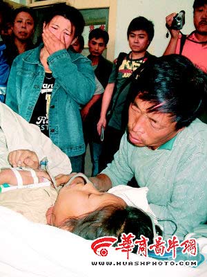 10岁的小玉小脸微黑,但是掩饰不住失血后的苍白,“叔叔、阿姨不伤心,我坚强,我不疼。”小玉说话的时候,由于失血干裂的嘴唇渗出血丝。