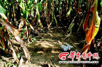 记者看到,现场有10余棵苞米被压倒,在成片的苞米地里,这成为了惟一一个空地。在这片被压倒的苞米丛中,有一棵苞米秆儿已经折断,顶部残留着血迹,它的周围布满凌乱
