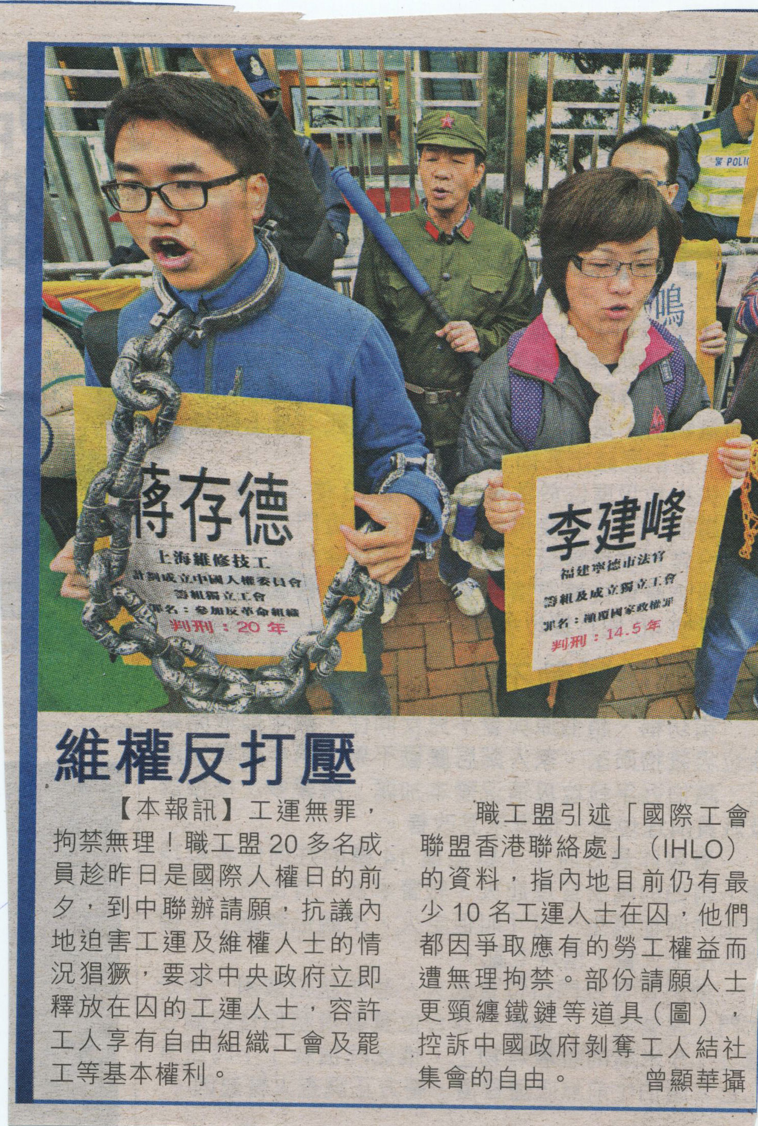 今天香港《爽报》报道一篇新闻,抗议河蟹政府打压维权人士,我关心的是抗议画面中的场景:一名文革时期军人,手持棍棒,模拟现在河蟹政府手持专政工具打压工人维权人士。