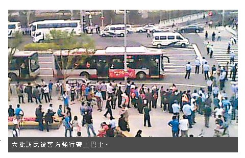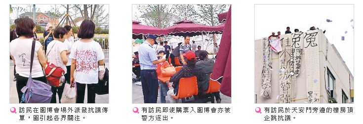 5月20日香港東方日報報導 裝甲車押走訪民京城舉行的中國國際園林花卉博覽會(下簡稱園博會)竟成全國各地訪民的申訴場地!第九屆園博會前日在北京開幕,吸引世界各地的參展者及觀眾到場,而來自全國各地的數千訪民,亦紛紛前往伸冤,令園博會頓成「冤博會」。當局大為緊張,部署大批公安武警全力「清除」,甚至出動裝甲車到場震懾,並協助押解訪民,消息指當日至少三千訪民被截獲及捉走扣留。另有一批訪民則在天安門附近圖集體跳樓抗議,最終被特警制止。