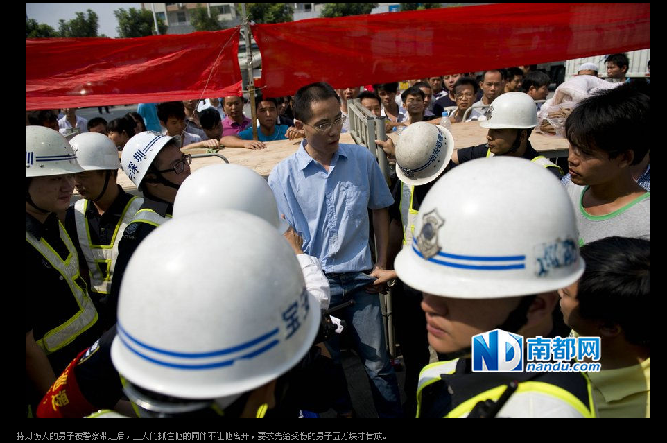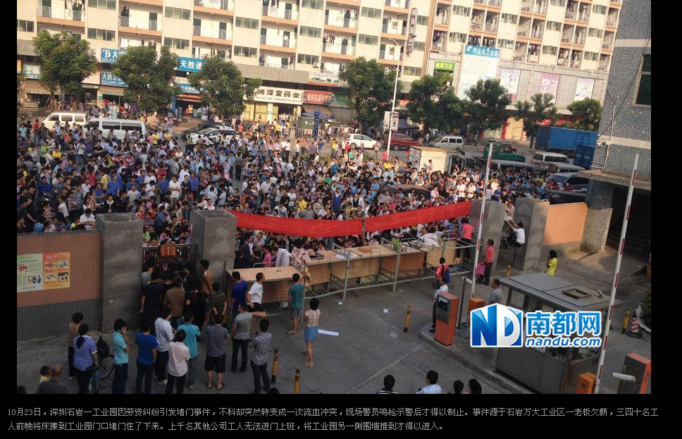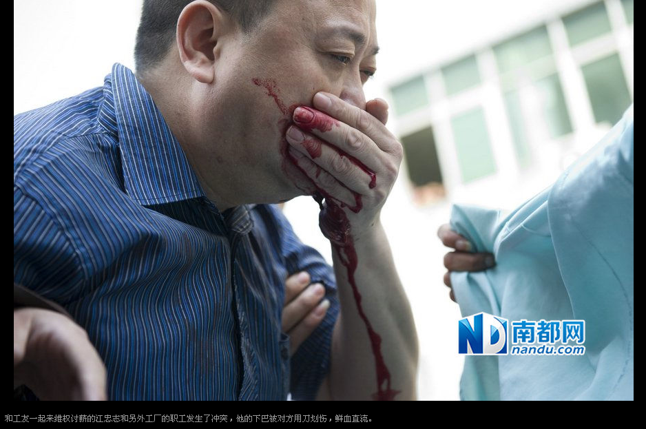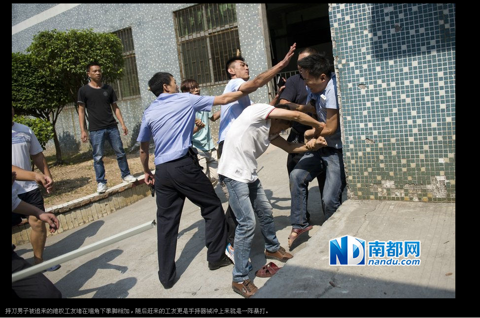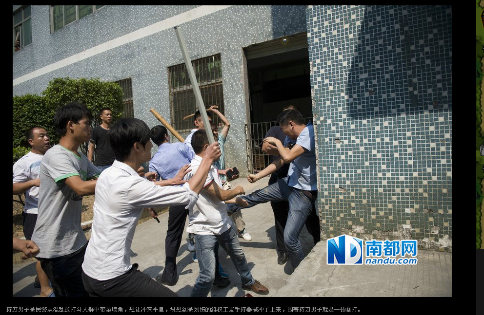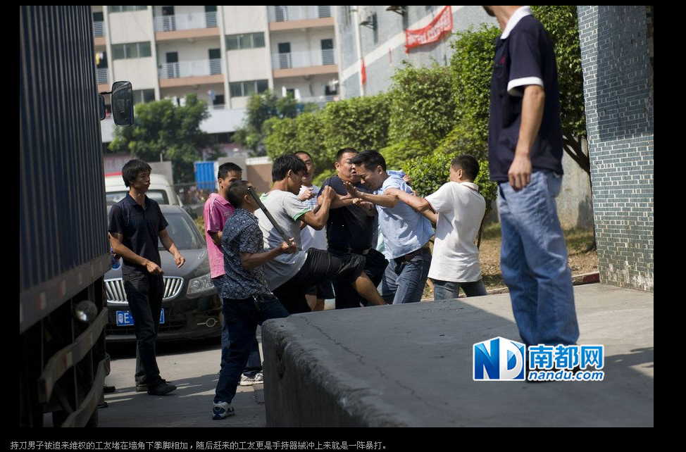 看看南都报是如何报导深圳工人讨薪酿成血战这一事件的:他们同情工人阶级被某些“黑心”资本家(剥削工人不是因为资本家心太黑)赖工人的工资,又把自己装扮成公正人的模样为资产阶级站台,掩盖事实真相,并精诚捍卫资本主义生产方式。持刀行凶者究竟是谁?在场记者难道没有向那些讨薪者采访?如果不是记者采访的新闻,那么图片下面的文字是怎么来的?如果持刀行凶者是另外一个工厂里的工人,上班心心切或者怕迟到被老板扣薪才与讨薪者发生争执而行凶,难道他不知道持刀行凶不仅会坐牢,而且在经济上也会受到损失?那样他岂不是得不偿失?按照生活常识也可以断定,那个持刀人很大程度上是被人收买的。发生在全国各地的农民抗击暴力拆迁,往往会看到地皮流氓的身影。这些人为了钱什么事都做,哪怕是行凶杀人也在所不惜。那些歇斯底里地吆喝着要“左右”合流的所谓“二次革命者”是不是也是这样的一副丑态,那只能在资本与劳动之间战争中才能让人们看得更加清楚。