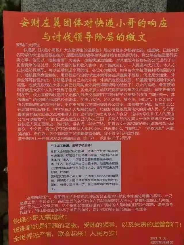 安财左翼学生和当地快递员的大字报
