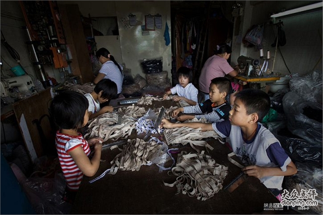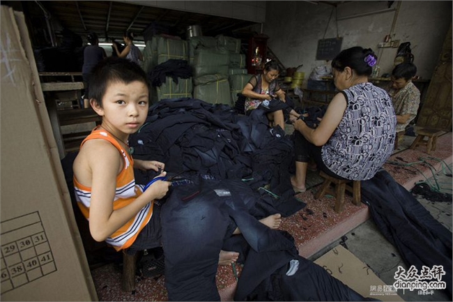 5、当地的许多妇女、老人甚至孩子都会做一些剪线头的工作来贴补家用。图为新塘镇大敦村的一家牛仔制衣厂里,孩子跟父母一起工作,每天为牛仔裤剪线头200条左右,每条赚一角五分钱。