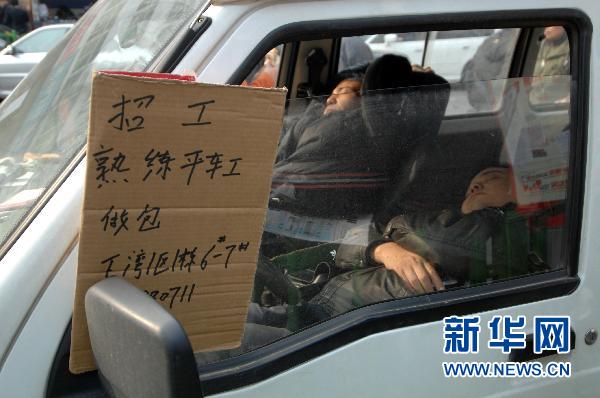 2月12日,在浙江义乌人才市场,两位开车过来的招聘者由于长时间无人应聘,在车里睡着了。新华社记者鞠焕宗摄