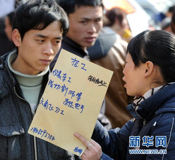 2月14日,在浙江义乌劳动力市场,众多企业招聘人员举牌招工。新华社记者鞠焕宗摄