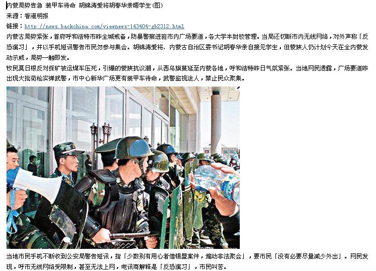 内蒙发生近30年来最大规模的反政府示威,牧民莫日根反对当局大肆采矿破坏环境,遭运煤车辗毙而引发的示威升级,演变成席卷全内蒙的抗议潮。在内蒙锡林郭勒盟最少四个旗,前天和昨天继续有大批蒙古族学生和牧民上街,要求当局保护牧民利益、草原生态,并悼念莫日根。当局担心继2008年西藏及2009年新疆骚动后,内蒙可能出现大规模族群骚乱,已采取戒严措施,试图平息持续五天的抗议行动。