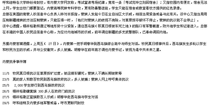 前日有2000名蒙族人在锡林格勒西乌旗政府前示威,并与警爆发流血冲突;昨日上午约300多名蒙族学生和牧民聚集锡林格勒正蓝旗政府大楼外游行示威。此外,东乌旗昨也有抗议示威活动。当地消息指,未来数日内蒙各地将有接力示威活动,已经排到6月4日。