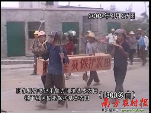 据了解,强征土地的现象并不止发生在英村。同在东城镇的报平村,2009年4月27日,曾有村民抬着棺材,敲锣打鼓地声称“誓死保卫农田”。