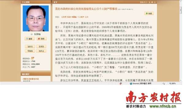 朱国瑜是茂名市外事侨务局公务员,因年初公开写下实名遗书为母申冤而闻名。2010年,朱母在与开发商发生纠纷中受伤,一个月后不治身亡。朱持续上访,当地机关对相关人员作出了行政处罚决定。朱一直坚持在网上公布茂名官场贪腐线索,7月12日和6日两次实名举报“身家过千万的副局长和官司机”。(来源:北京青年报)