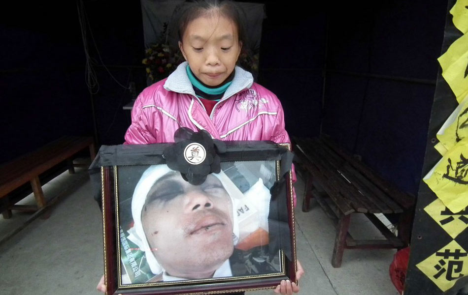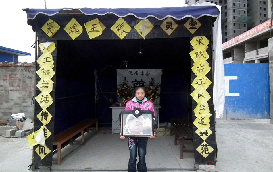 2011年9月14日上午,从事建筑粉刷工的安徽南陵县太丰镇王根祥、王根海兄弟俩和表弟毛根海3人,来到安徽芜湖市东方砻城在建小区内曾打工的工地结算讨要工资,却没有想到竟遭到项目工地多名人员的殴打,王根祥被人用2米长的钢管当场打倒在地,头部被重创打裂,送往医院不治身亡,而他的哥哥王根海的左手和左腿也被人打伤,毛根海的背部被钢管打断,将面临瘫痪的危险。目前,当地警方已抓获了数名打人者。 图为19日,王根祥女儿手捧爸爸遗像。