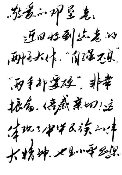 华龙网讯(记者肖竹)邓小平同志之弟、重庆市原副市长邓垦老人,十分关注重庆的改革发展,赞赏重庆这些年的探索实践。前不久,他给市委书记薄熙来题字,希望重庆“自强不息”,“两手都要硬”。国庆节时,薄熙来给老人回信,表示“一定要坚持改革开放,坚持四项基本原则,两手都硬,把中国特色的社会主义建设好”,“把重庆建设好!”