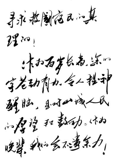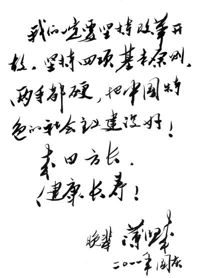 在信中,薄熙来还说:“作为百岁长者,您的字苍劲有力,令人提神醒脑,是对山城人民的厚望和鼓励。作为晚辈,我们会不遗余力!我们一定要坚持改革开放,坚持四项基本原则,两手都硬,把中国特色的社会主义建设好!”