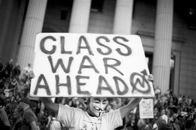 5日,纽约,“占领华尔街”示威者脸戴面具,高举写着“阶级战争在前方”的牌子。