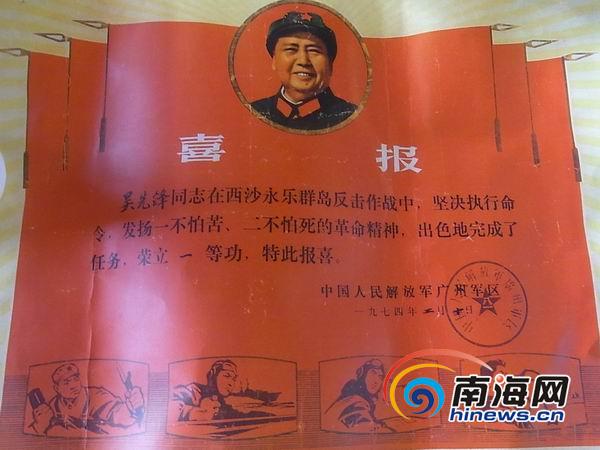 吴先锋获得的一等功证书(南海网记者孙令正摄)
