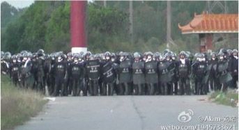 据当地村民微博上的讯息:“今日凌晨4点30分,村民正常生活受到扰乱,村内敲响铜锣集体警戒各自拿起棍棒集结村口与警方对峙。早上六点警方以撤退吸引村民出村,村民以为警方已经撤退试图在村口布置树木拦路预防警方进村骚扰,警方立即调头向村民施放数十个催泪弹引起草地起火并发射水炮。数百警力冲进我村之到七时许缓缓退去!”